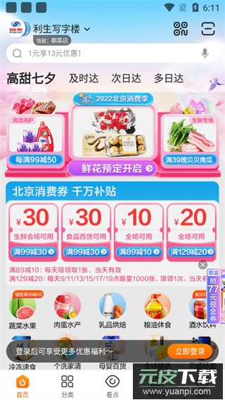 提供新鲜果蔬、肉禽水产、米面粮油、休闲零食、酒水饮料及家居清洁等多样商品;每日货源充足,全面保障家庭日常生活所需。