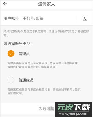 3、跳转至邀请家人页面,输入对方的账号信息,将权限类型设置为管理员,点击“发起邀请”。