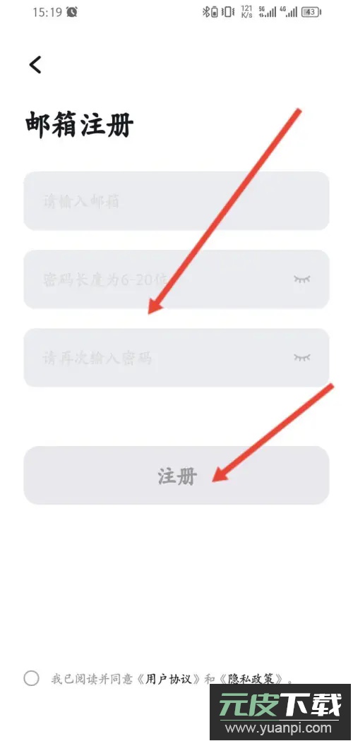 3、在随后显示的页面中,准确填写邮箱地址与密码,最后点击注册按钮即可完成。