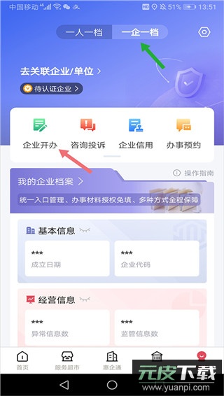 1、打开并登录江西政务服务平台App,完成实名认证后进入【我的】页面;点击顶部导航栏中的【一企一档】,切换至企业服务专区,随后选择【企业开办】功能;