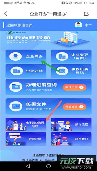 3、若企业尚未开通一网通办业务,需点击【企业开办】进行开通;已开通的企业则可直接点击【电子营业执照领取】;
