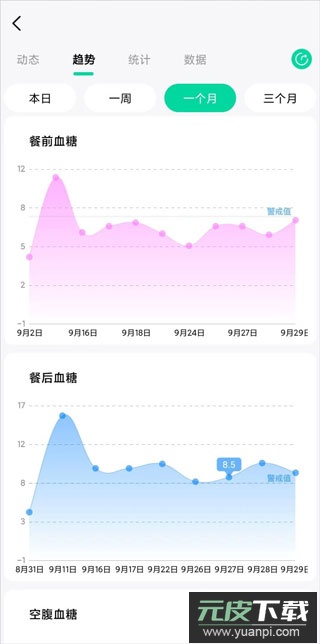 每个测量值都具有参考意义,应用会将每日、每周、每月及三个月的血糖数据绘制成趋势图表,并估算糖化血红蛋白与平均值。趋势图能清晰反映空腹、餐前及餐后血糖的整体变化,帮助用户掌握波动规律。
