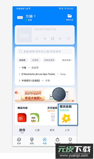 一、首先启动天猫精灵应用,进入内容界面后点击精灵技能功能