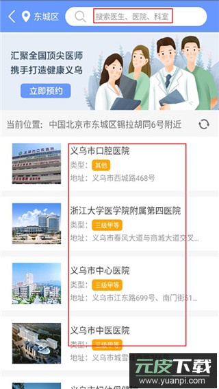 2、搜索目标医院名称,或依据定位推荐选择附近医疗机构。