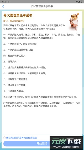 3、签订“养犬管理责任承诺书”,然后点击“开始登记”。