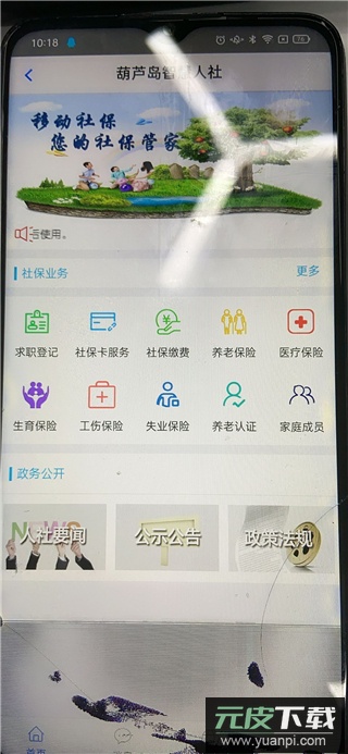 2、进入首页,可见社保业务、政府公开等板块,包含医疗保险费、工伤保险、失业保险、政策法规及人社要闻等内容;