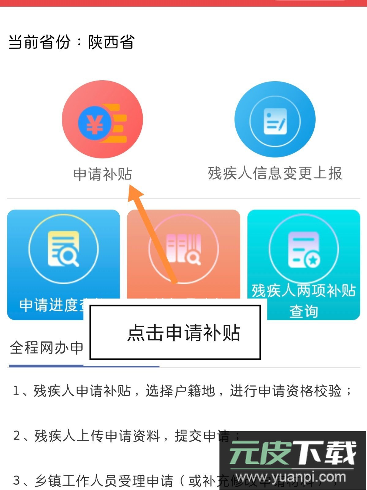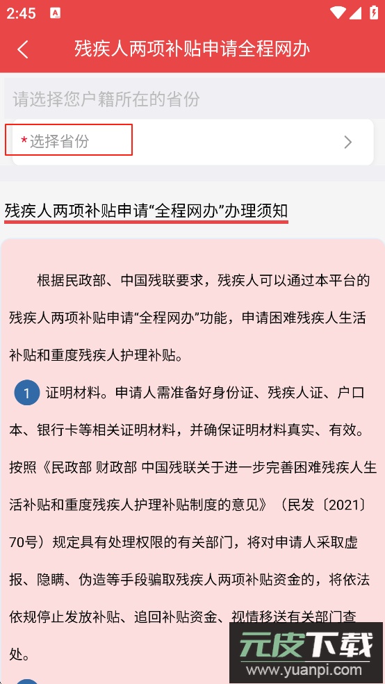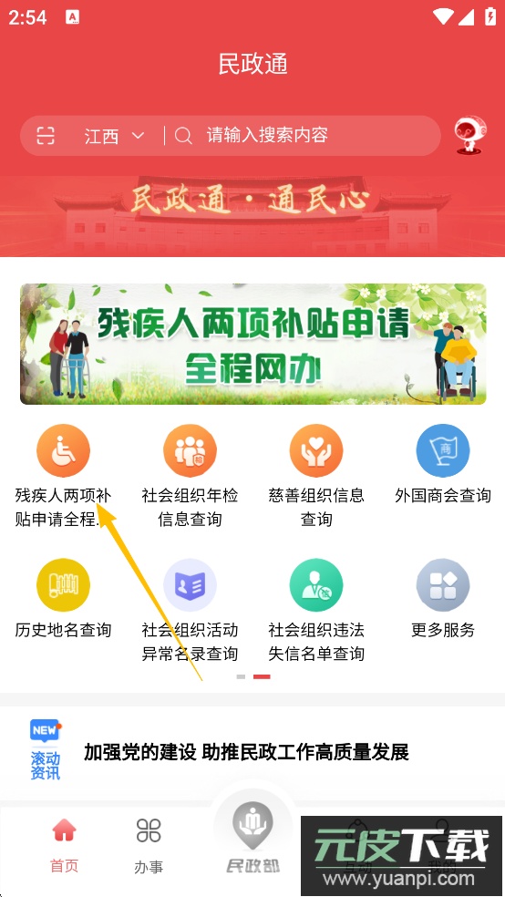 1、打开app,完成注册登录,点击进入【残疾人两项补贴申请“全程网办”】服务。