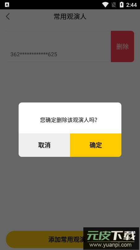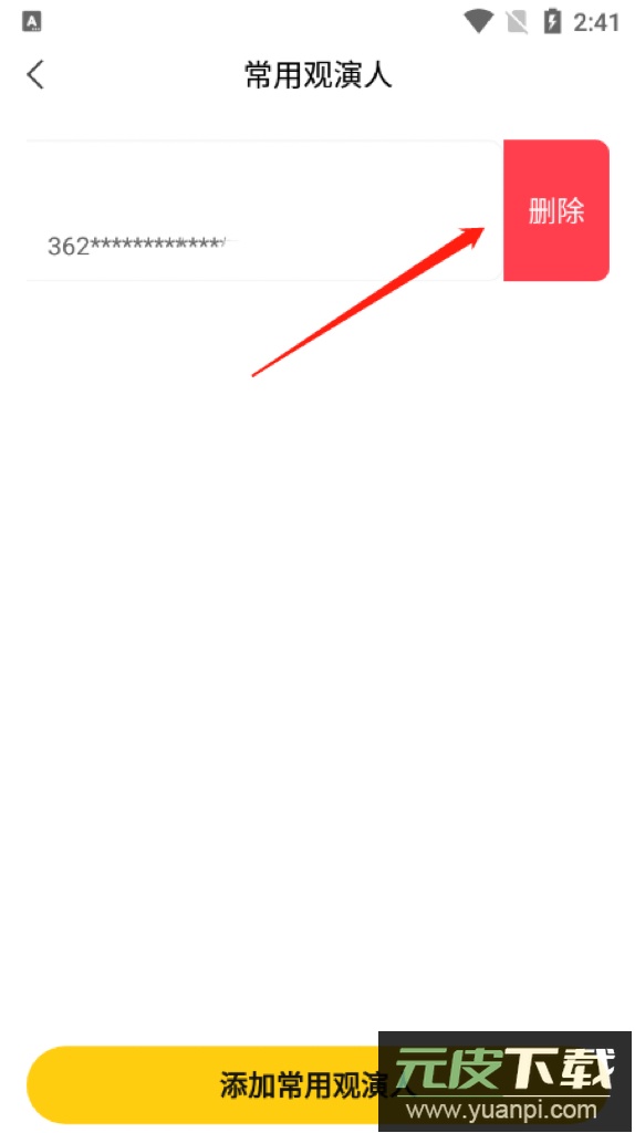 2. 在观演人信息栏向左滑动,点击删除按钮;