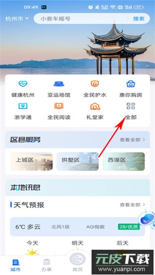 2、进入应用主界面,在城市页面点击“全部”进入线上一站办服务区;