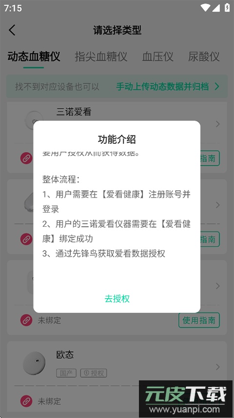 3、连接前需在爱看健康APP完成账号注册与登录,再通过先锋鸟APP获取爱看数据授权;