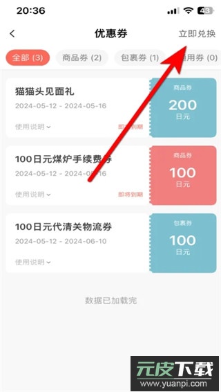 3. 在优惠券页面内,点击右上角的“立即兑换”按钮。