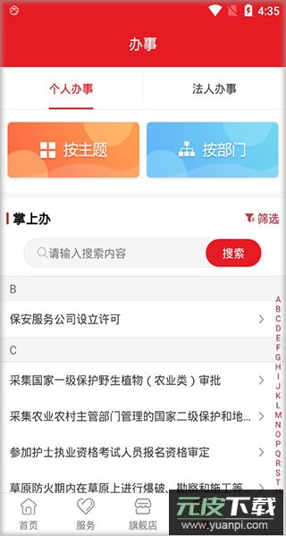 4、再次右滑进入办事专区,按个人或法人身份选择事项,支持按主题或部门分类办理。