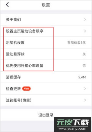 3、设置功能,用户可以在该页面中对设置主页运动设备顺序、划船机设置、运动悬浮球、优先使用外接心率设备四大内容根据自己需求进行设置。