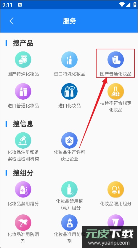 2、接着在搜索产品栏目中,根据要查验的化妆品类型进行选择,例如选择【国产普通化妆品查验】。
