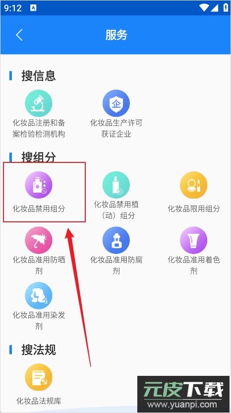 2、向下滑动页面,在【搜组分】分类下选择【化妆品禁用组分】。