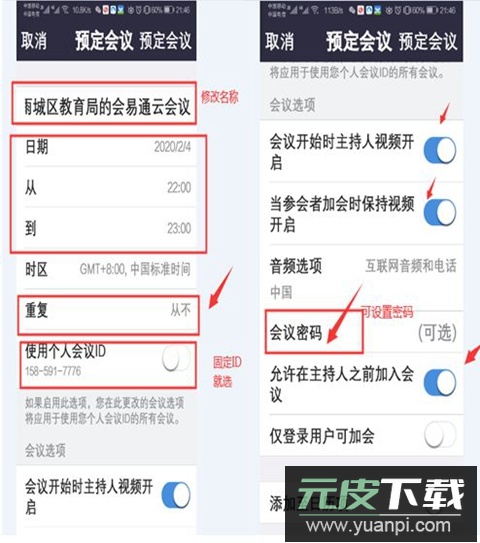 2. 在预定会议窗口中填写会议主题、日期、开始与结束时间;可选择性设置会议密码或限定参会者域名,以提升会议安全性,参与者需输入密码方可加入。