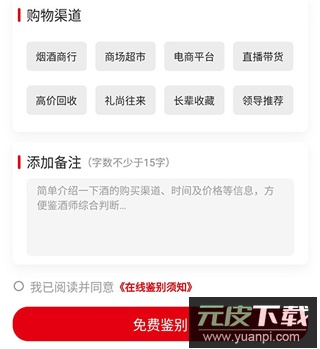 4、最后填写购买渠道信息,补充必要备注,点击免费鉴别提交申请,即可等待专业鉴酒师给出鉴定结果。