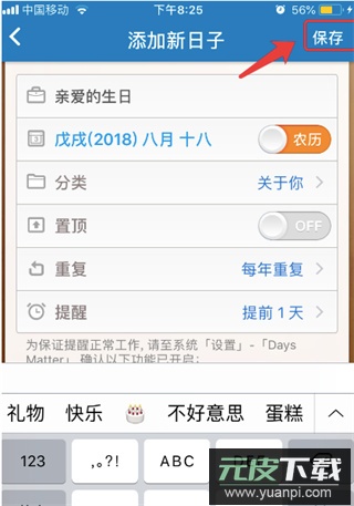 2、在编辑页面填写事件名称、日期等信息,并设置提醒方式与分类;