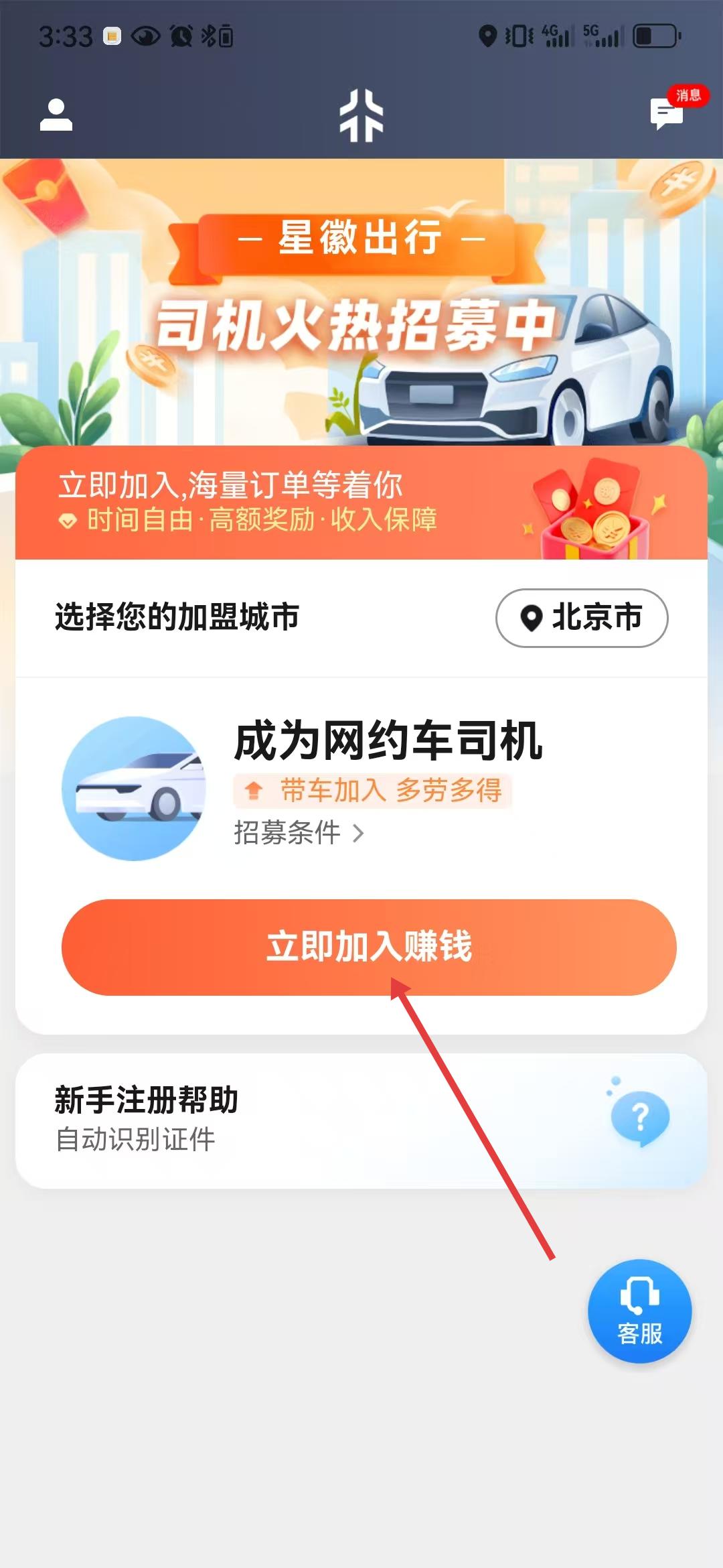 2、司机招募界面内,列举了时间自由、高额奖励、收入保障等相关优势,用户可先选择加盟城市,点击立即加入赚钱按钮就能申请成为网约车司机;