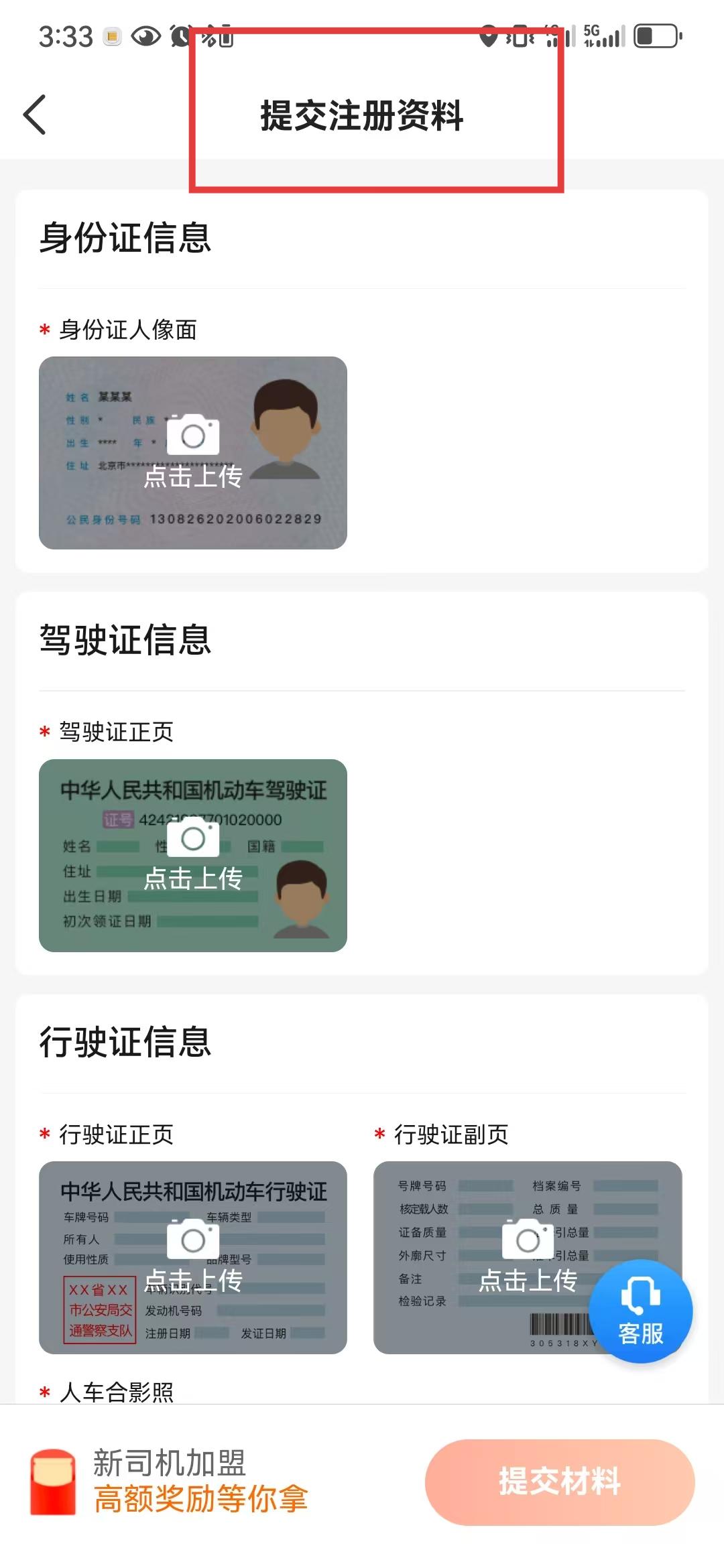 3、进入提交注册资料的界面,界面划分了身份证信息、驾驶证信息、行驶证信息等板块,按要求完成所有资料上传后,点击提交材料按钮就能完成注册资料提交;