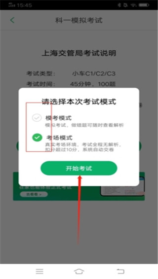 3、平台提供模考模式和考场模式两种考试模式可供选择,选好对应模式后,再次点击“开始考试”;