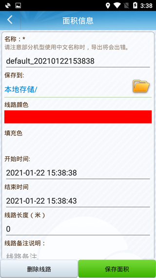 4、软件会自动测算用户行走路径围合区域的实际面积,测算结果支持本地保存,方便后续调取使用;