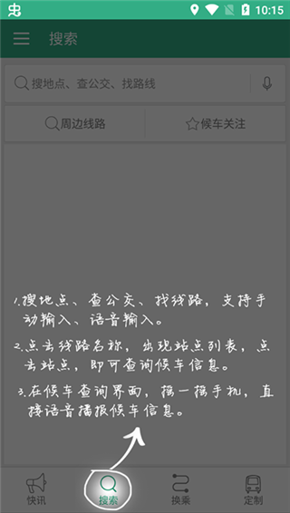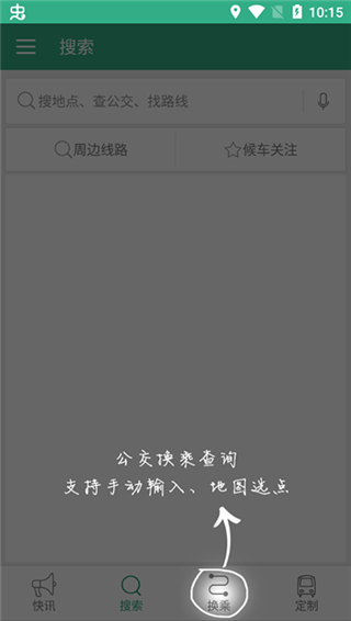2、首页的搜索栏板块,可以满足查公交、找路线、搜地点的各类需求