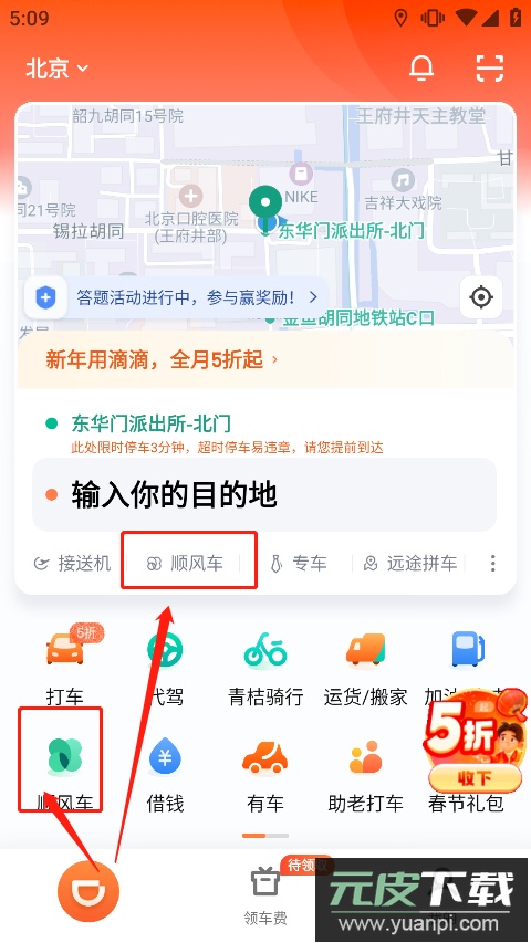 1、打开应用首页,点击“顺风车”入口进入相关页面。