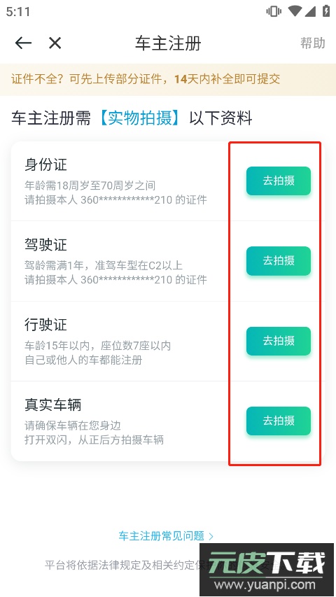 3、按要求逐步上传身份证、驾驶证、行驶证及车辆照片等资料。