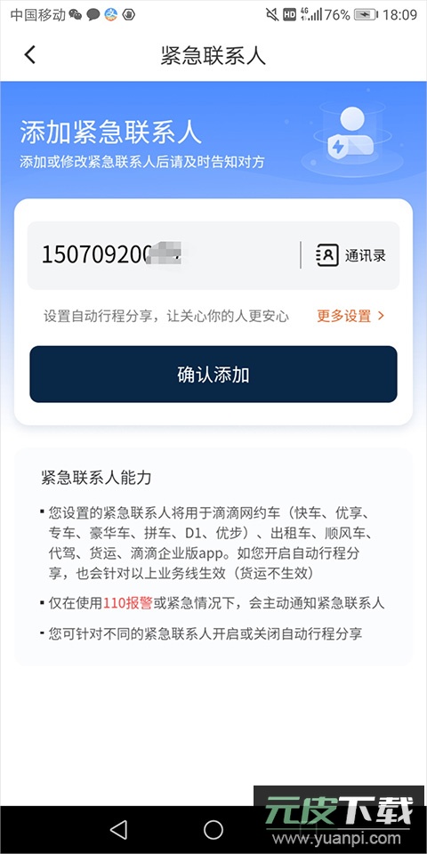 3、进入新页面后,手动输入紧急联系人的手机号码,或直接从手机通讯录中选择添加