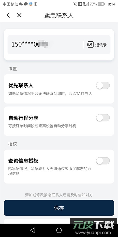 5、在新开启的页面中,依次将【优先联系人】、【自动行程分享】、【查询信息授权】等功能按钮打开,最后点击下方【保存】按钮,即可进一步提升出行安全等级