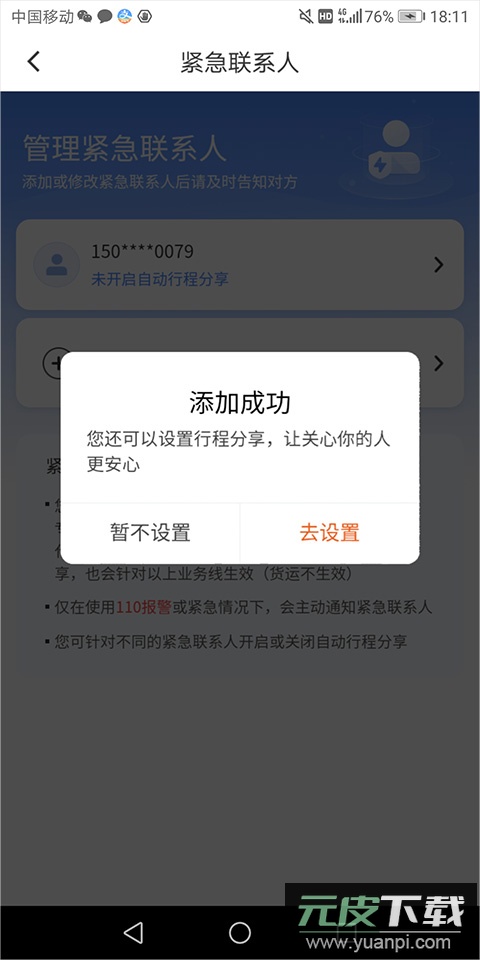 4、添加成功后可以继续点击【去设置】,开启行程分享功能,让家人朋友随时了解你的出行状态