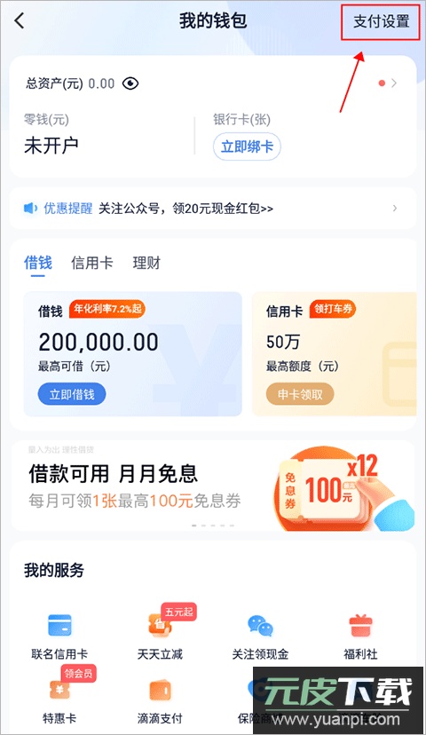 2、进入我的钱包界面后,点击右上角的“支付设置”