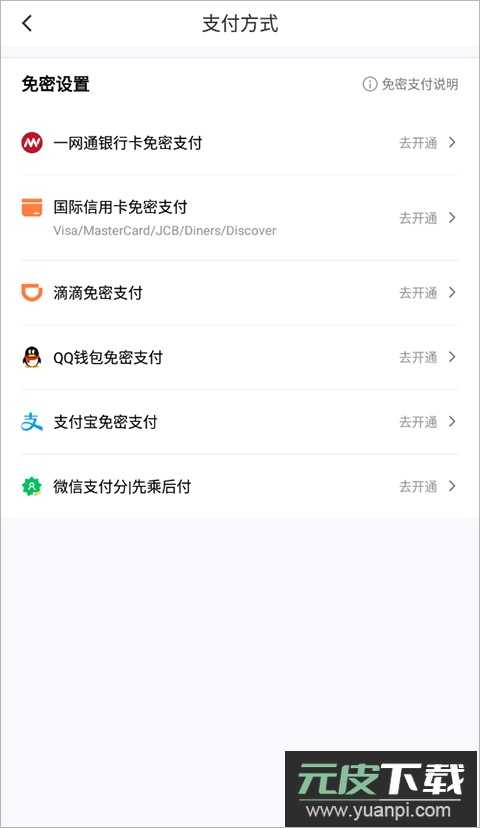 4、选择需要开通或关闭免密支付的付款方式,点击去开通或相应关闭按钮即可完成设置