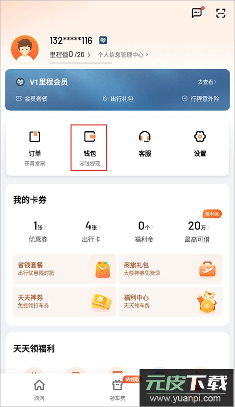 1、打开应用,在“我的”页面中选择“钱包”入口