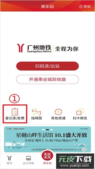 1、打开广州地铁应用,在首页点击查记录或发票选项;