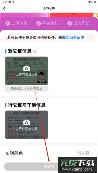 5、按照提示上传驾驶证与行驶证照片,提交资料等待审核通过。