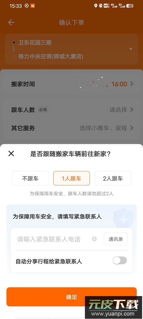 5. 选择是否有人随车同行,并填写紧急联系人的相关信息。