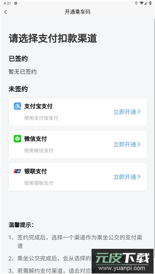 3、选择需要签约的支付平台,跳转至对应页面完成绑定;目前支持支付宝、微信及银联三种方式