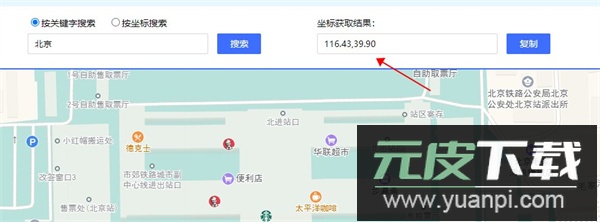 3、页面跳转后,在搜索框输入需要查询的地点,页面上会直接显示对应的经纬度信息。