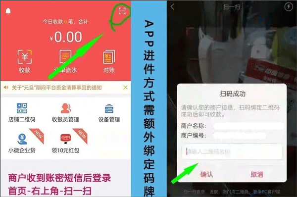 1、商户登录应用后,点击首页右上角的扫一扫功能,扫描二维码牌并输入商户信息即可完成绑定。