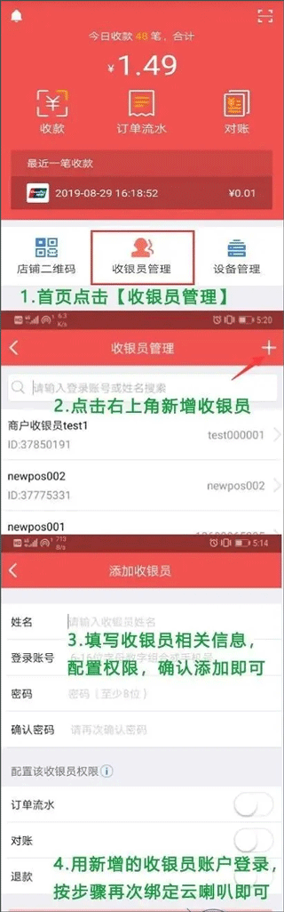 4、支持添加多名收银员账号,便于进行分工与统一管理。