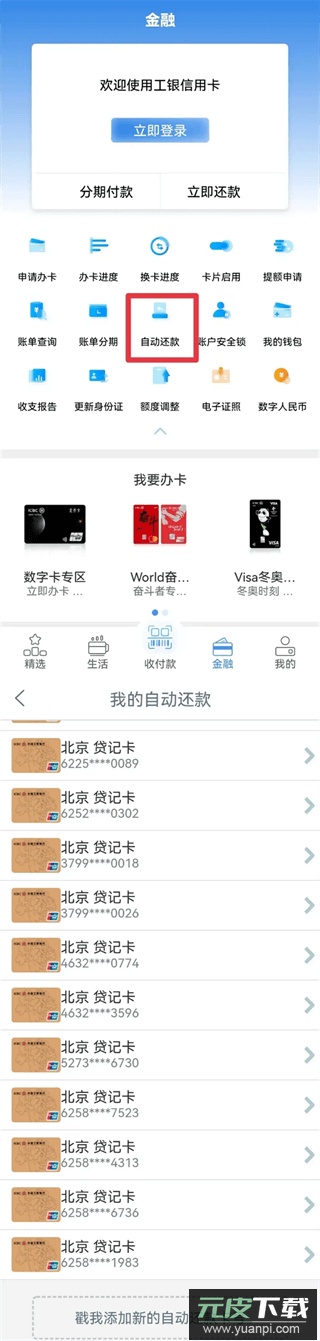 1、登录应用后进入“金融”页面,点击“自动还款”可查看已设置自动还款的信用卡;
