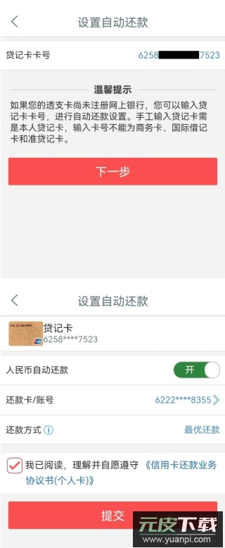 2、若未开通该功能,点击“戳我添加新的自动还款卡号”,输入卡号后选择还款卡片与还款方式,阅读并同意《信用卡还款业务协议书(个人卡)》后提交即可完成设置;