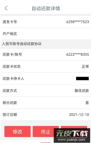 3、对已开通自动还款的卡片,进入详情页可查看协议、修改或终止还款计划,并查询自动还款记录。