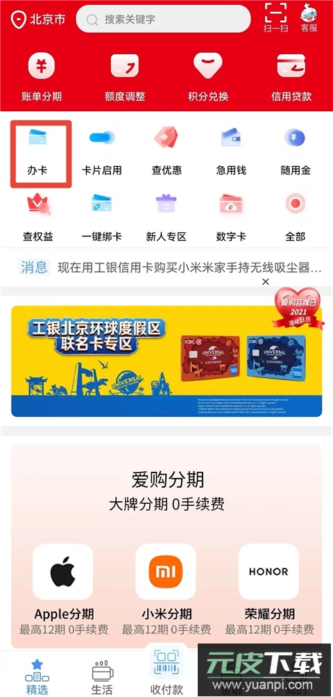 第一步,打开应用进入主界面,点击精选或金融栏目,进入信用卡申请页面;