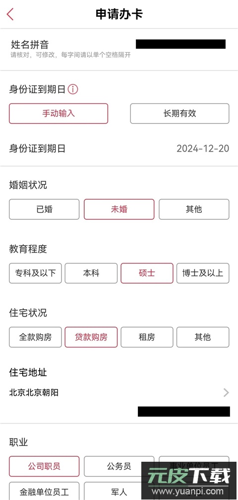 如为新客户,则需继续补充身份证有效期、婚姻状况、教育背景、居住信息、职业资料、收入情况、紧急联系人及详细收件地址等内容,完整填写后即可提交申请。