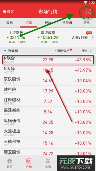 2、在行情页面的右上角找到搜索图标(绿色圆圈),输入想要查询的股票名称或代码,例如图中红色标记部分,点击搜索结果。