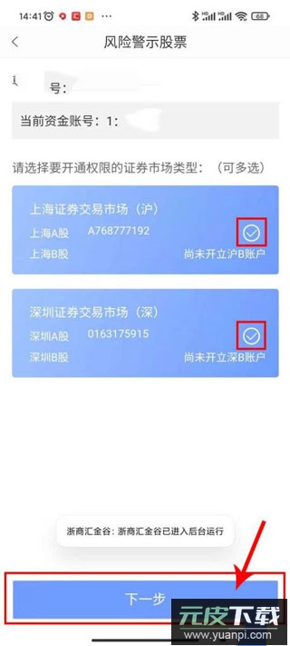 6、分别勾选上海证券交易所和深圳证券交易所,然后点击页面下方的“下一步”。