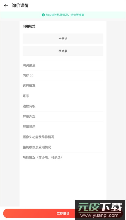 4、填写设备详细信息,包括购买渠道、存储容量、外观状况等,完成后提交并获取估价。